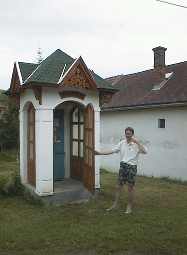 Ökotelefon (a környezetbe illeszkedő telefonfülke). Kalauzunk elmondta, milyen komoly engedélyeztetési nehézségeken kellett átküzdeniük magukat a tervezőknek...