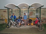 Az eső elálltával bátran útnak indultunk. Megint egy elmaradt program következett: Ikervár kastélya és a Gothard Jenő által tervezett régi vízerőműve. A gyanús idő miatt inkább levágtuk e kitérőt, és Csénye felé kanyarodtunk. Bögötnél aztán a műút elfogyott és egy kellemes erdei útban folytatódott. Csak akkor csodálkoztunk el, amikor pár kilométer után az erdő is elfogyott, és egy nem várt autópálya keresztezte utunkat, kerítéssel körbevéve. Hiába, (legalább ebben) fejlődik az ország, nem szerencsés régi térképekkel utazni. Szerencsére meglett a híd felette, és még Tepi is át tudott hajtani rajta a kísérő autóval. Acsádnál járva a közeledő kőszegi hegység felett viszont fekete fellegek kezdtek még gyorsabban közeledni. Egy darabig még hanyagoltuk őket, és élveztük a látványt a villámokkal, de a fellegek felénk értek, és elkezdett szakadni az eső. Ekkor már három csoportra szakadtunk, és a három csoport három különböző faluban ragadt le: Meszlenben a temető ravatalozójának fedele alatt, Kőszegpatyon két buszmegállóban, és Nemescsóban egy tűzoltószertár teteje alatt - de a tűzoltók megérkezésével ők innen is kiszorultak. Esténket a kőszegi kempingbe terveztük, de erről lemondhattunk, valami más alternatíva után kellett nézni.