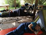 Kellemes volt a hajnali napsütésben kikászálódni és körbejárni a tavat. Ekkor már 1-2 helybéli horgász is feltűnt. Találkoztunk egy igazi biciklis kéktúrázóval is, aki a teljes távot gyűrte, és hétvégére már be is tervezte fejezni a túrát a Zemplénben - mi ennél kicsit lassabban haladtunk... Kényelmesen összepakoltunk, eközben befutottak az előző este eltűnt társaink is - így a létszám ismét teljes lett. Visszatérve a békés kis faluba, Hencida felé indultunk tovább.